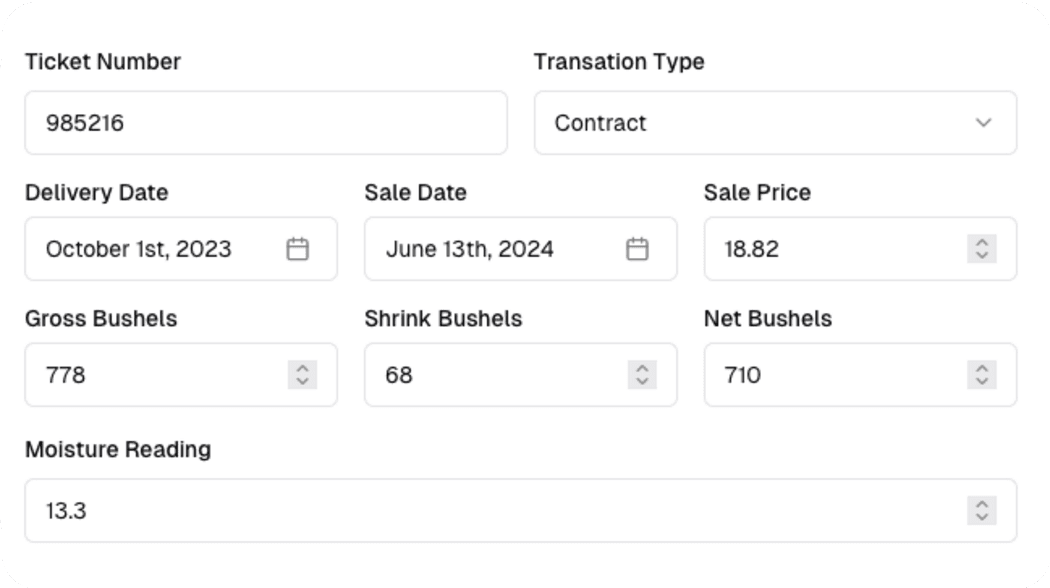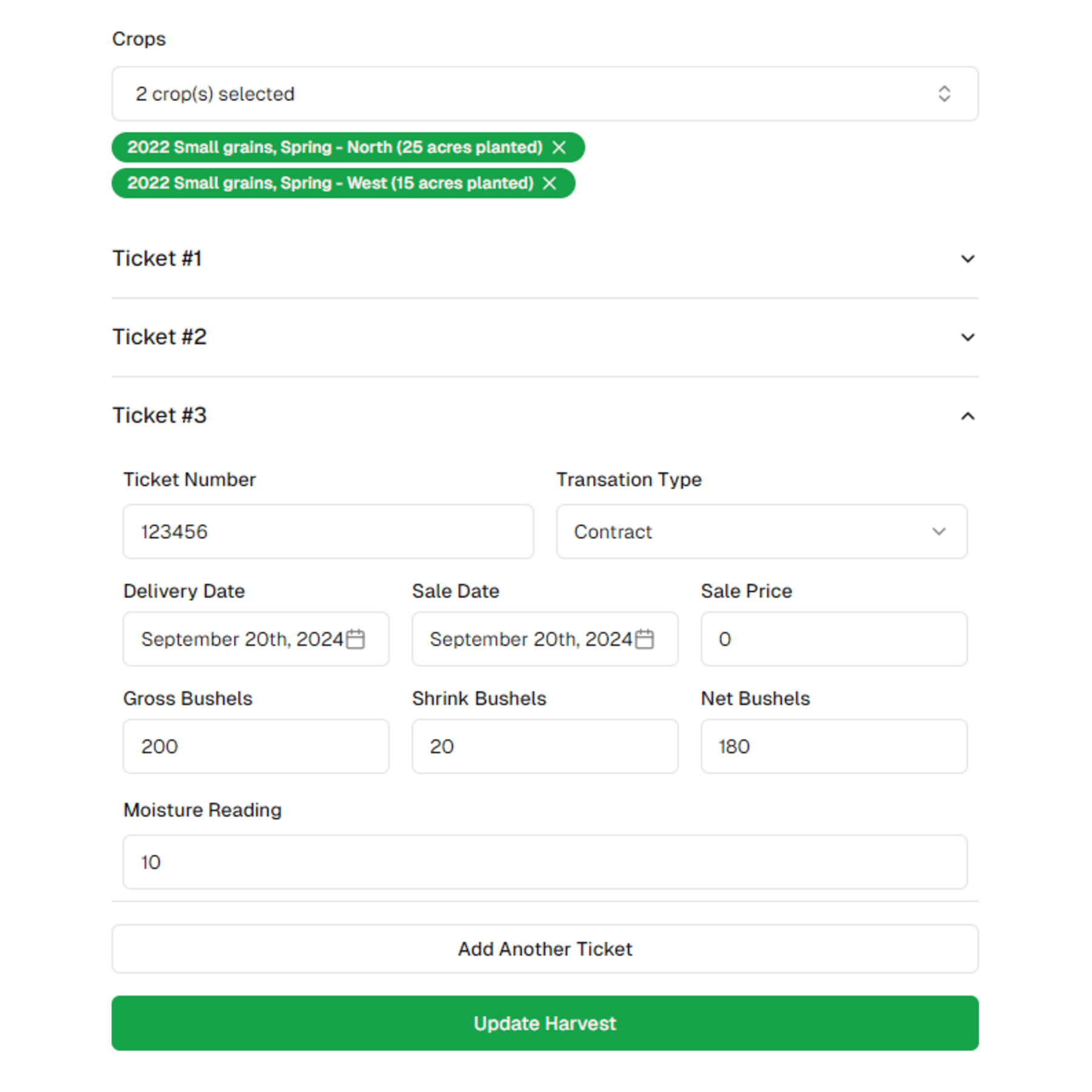 Enter elevator tickets to calculate harvest. Monitor farmed acres, yield, moisture, sale information and more.